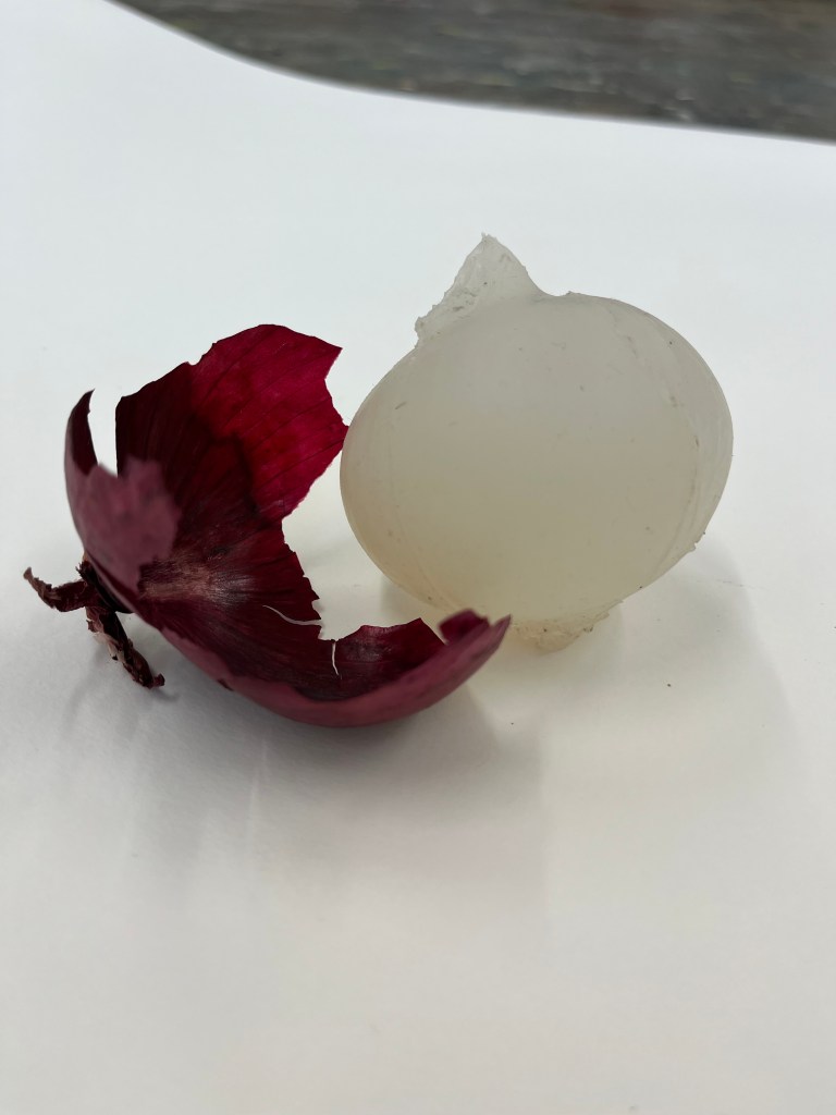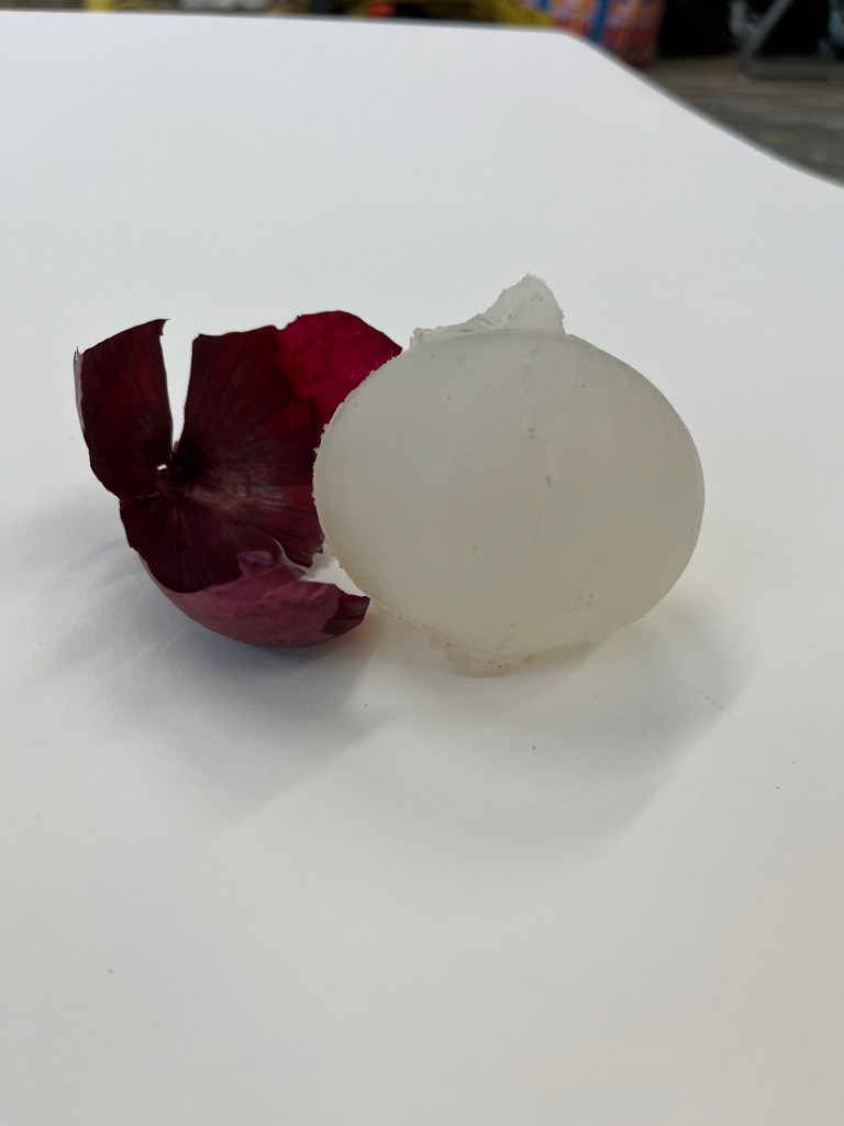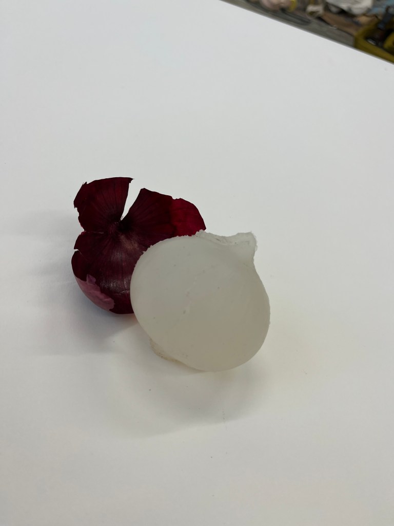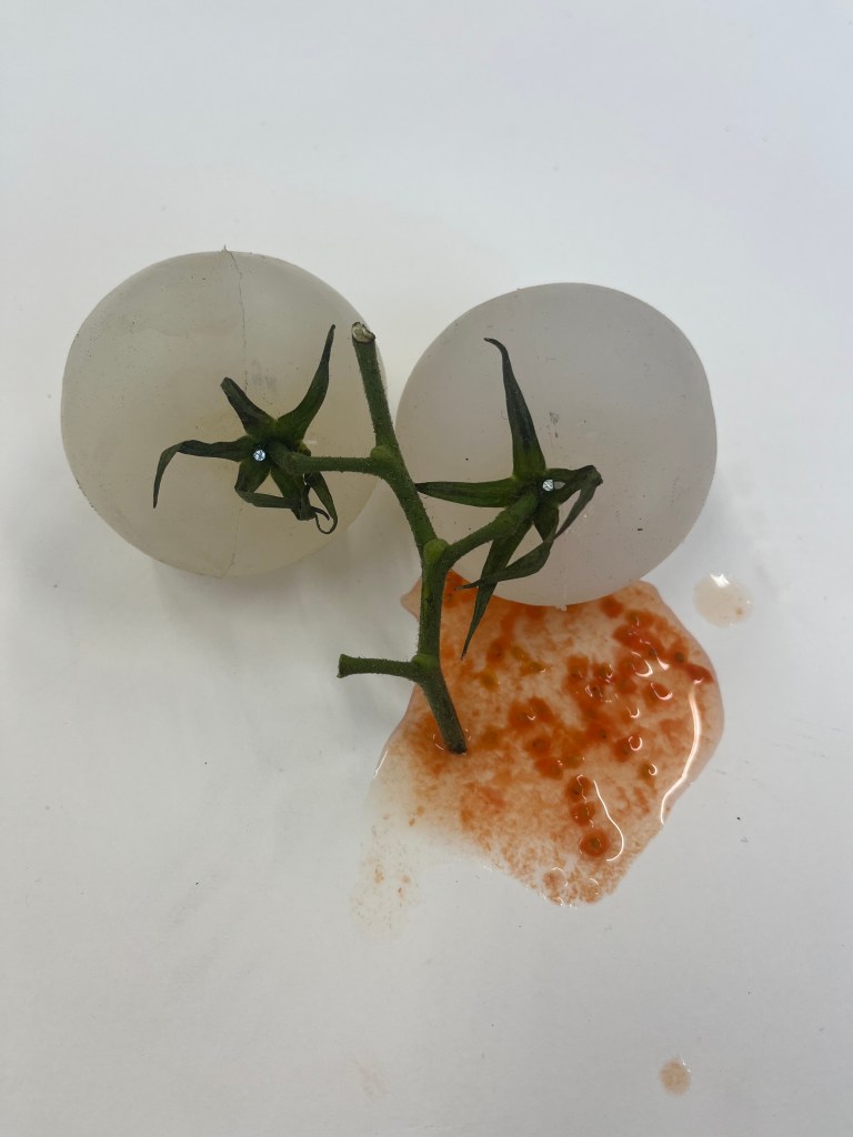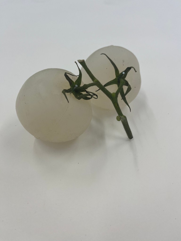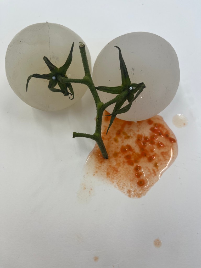 made by casting tomatoes and onions. reduced to clear transforms the shape/form of vegetables into a clear silicone. removing the colour and the vibrance and playing with the role messaging around fresh food has.